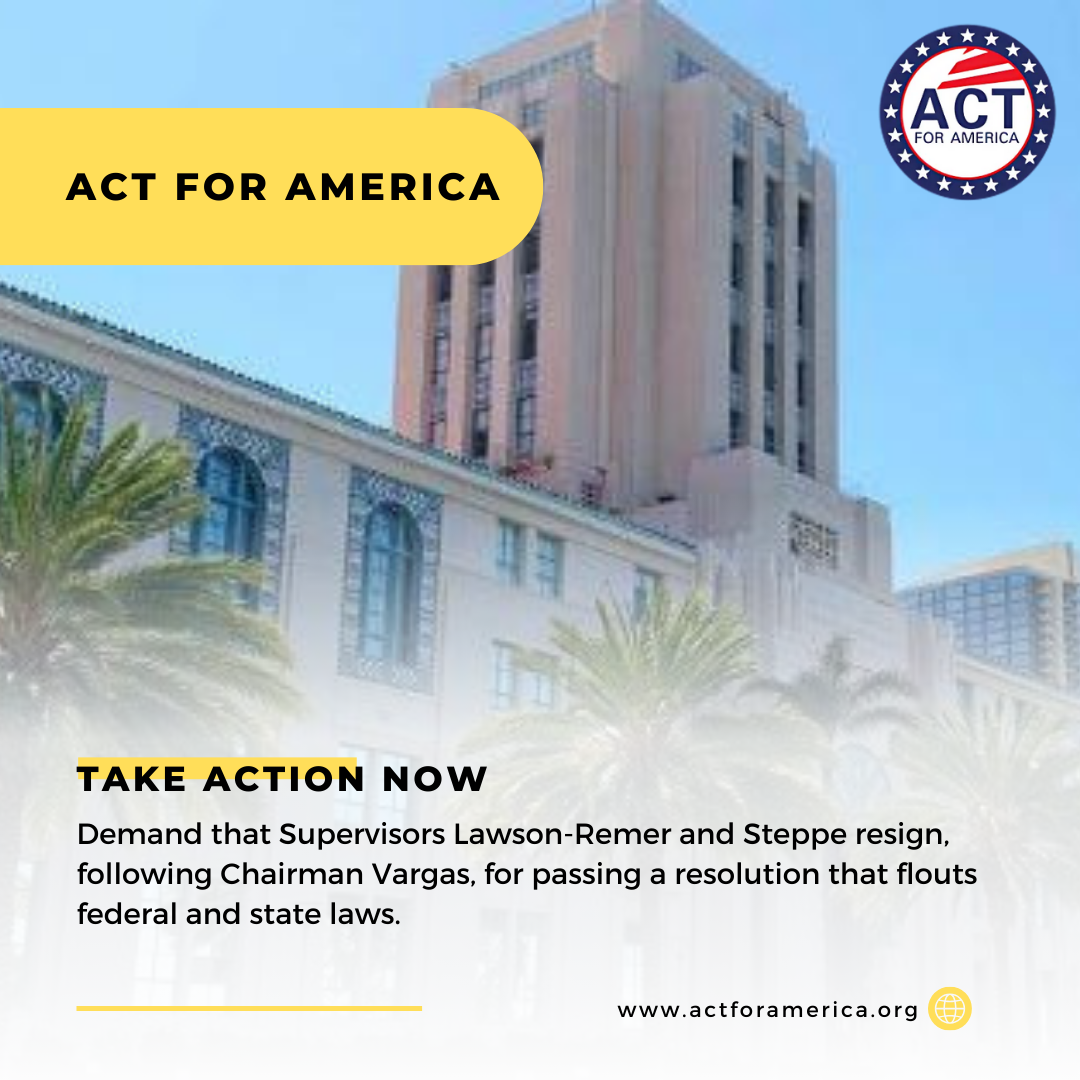Stand for lawfulness and safety in San Diego by demanding immediate action to protect our community. Supervisors Lawson-Remer, Steppe, and Vargas have jeopardized public safety by supporting a "Trump-Proof" sanctuary policy that disregards federal and state laws, and their resignations are necessary. We must urge Supervisors Anderson and Desmond to repeal the Sanctuary Resolution, end taxpayer funding for illegal activities, and ensure that public resources benefit legal residents only. Additionally, it is crucial to demand a special election to replace leaders who compromise the county's integrity and safety. Contact the Board today and join the effort to restore lawfulness and safeguard San Diego County. Act Now